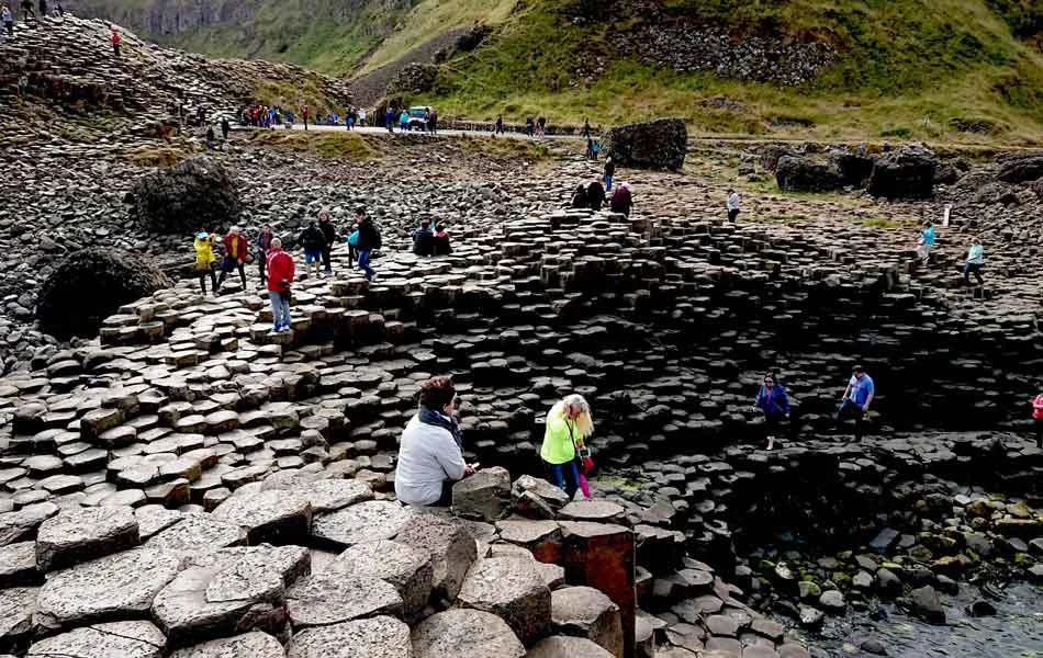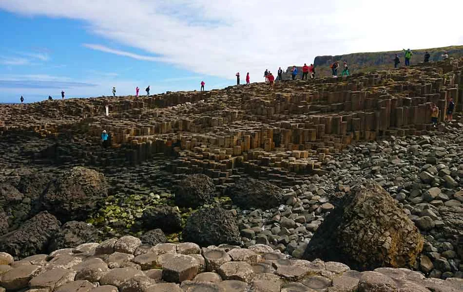 The Causeway lies at the foot of the basalt cliffs along the sea coast on the edge of the Antrim plateau in Northern Ireland. It is made up of some 40,000 massive black basalt columns sticking out of the sea. These geological formations were formed 50–60 million years ago during Tertiary volcanic activity, and are a major tourist attraction.
